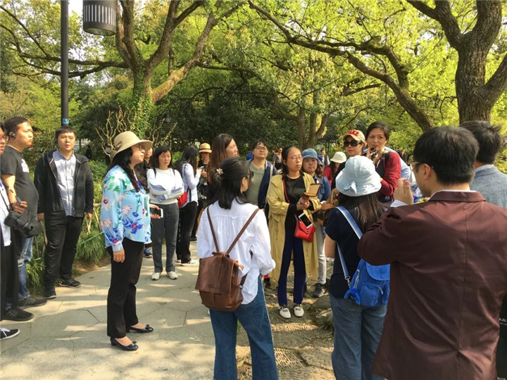 應(yīng)求是老師先帶學(xué)員走進(jìn)花港觀魚,講述花港觀魚公園中的植物配置,首先從植物氣質(zhì)說起,香樟婀娜,雞爪槭秀美,不同氣質(zhì)的植物種植在不同區(qū)域的效果,然后講述杭州的植物景觀因大氣候、小氣候的區(qū)別每年都不同,今年可以見到櫻花未落盡,海棠已盛開,晚櫻、桃花、海棠、紫藤等一同時(shí)間都綻放的壯美景觀。