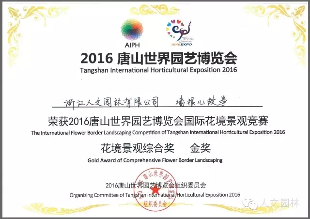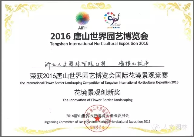 2016年6月10日,由杭州人文園林設計有限公司設計,浙江人文園林有限公司營造的“墻根兒故事”為主題的花境作品,獲“2016唐山世界園藝博覽會國際花境景觀競賽”花境景觀綜合獎金獎和花境景觀創新獎。