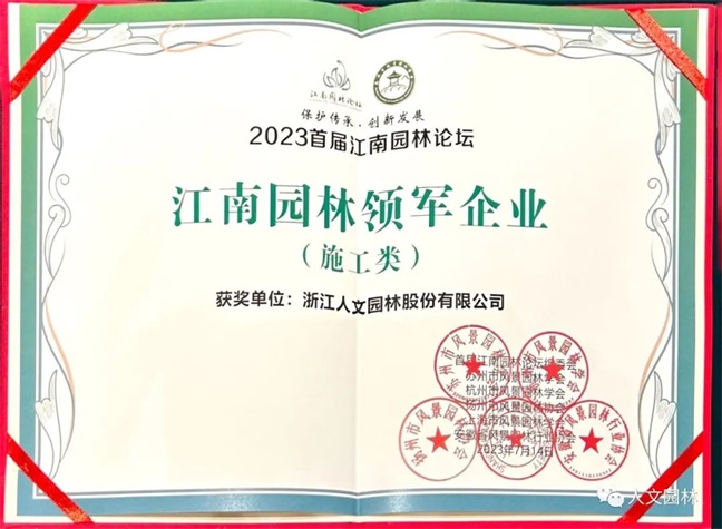 首屆“江南園林論壇”對“江浙滬皖”地區的34家優秀園林企業進行了表彰,授予“2023首屆江南園林論壇江南園林領軍企業(施工類)”的榮譽稱號,人文園林獲得了這一殊榮。