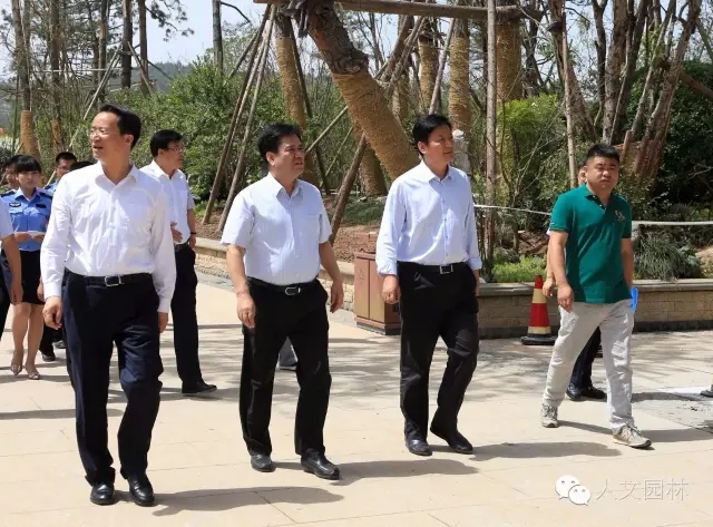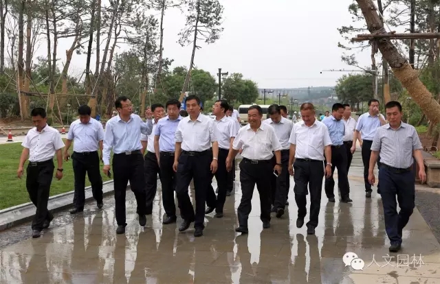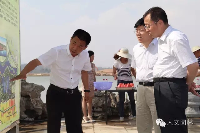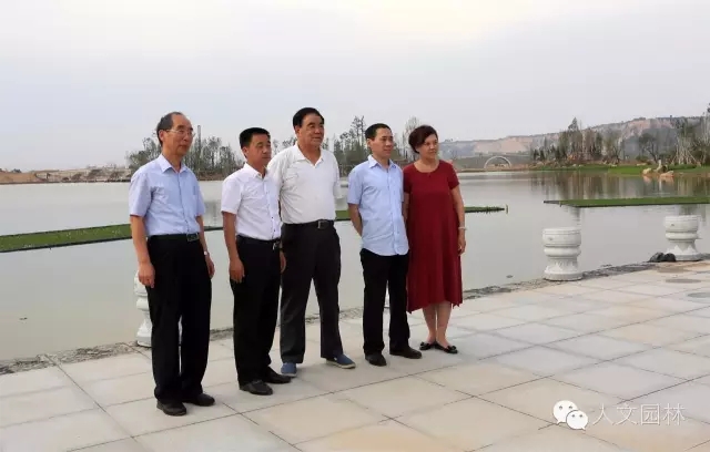 陜西省副省長張道宏(左二)到國家文史公園視察,韓城市市委書記、市人大常委會主任李智遠(左一)和韓城市市長褚錦鋒(右二),以及浙江人文園林有限公司副總經理洪利民(右一)陪同。李智遠書記為張道宏副省長詳細介紹了澽水河改造方案、韓城市污水處理計劃和文史公園的設計方案、施工進度,得到了張道宏副省長認可。